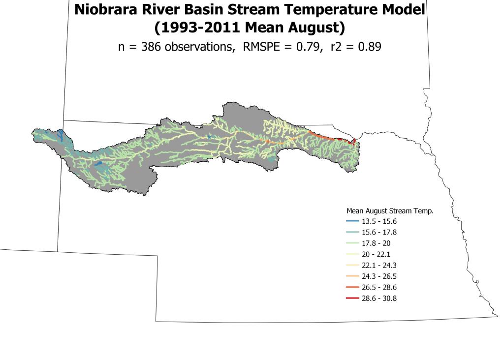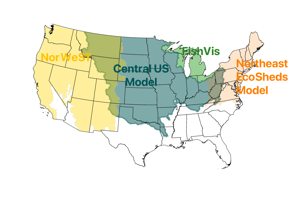 The Central U.S. Stream Temperature (CENTRUST) model will estimate historical and future mean August stream temperatures across the Great Plains and surrounding states. It is inspired by the NorWeST model from the western U.S. and will be a significant step towards a national stream temperature model. The area of the initial model run is shown below.